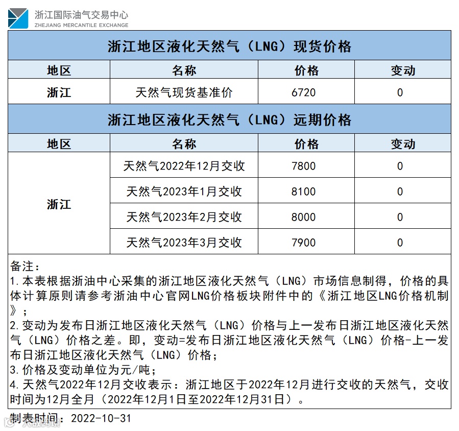 【价格指数】浙江地区液化天然气(LNG)价格(20221030)