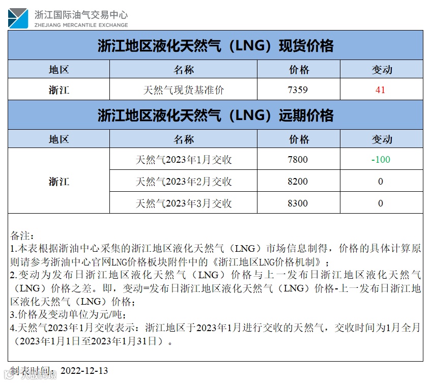 【价格指数】浙江地区液化天然气(LNG)价格(20221213)