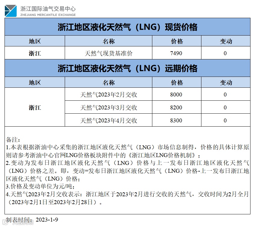 【价格指数】浙江地区液化天然气(LNG)价格(20230107、20230108)