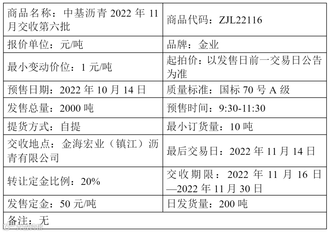 中基宁波集团股份有限公司定于2022年10月14日在产能预售系统中发售2022年11月交收第六批沥青产品,具体信息如下: