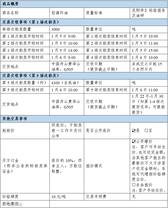 受有关部门委托,浙江国际油气交易中心有限公司(简称“浙油中心”)将于2022年1月5-6日通过交易系统公开拍卖轻循环油。现将有关的拍卖事宜告知如下: