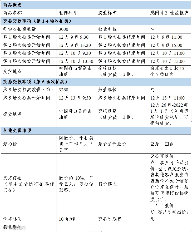 受有关部门委托,浙江国际油气交易中心有限公司(简称“浙油中心”)将于2021年12月9-13日通过交易系统公开拍卖轻循环油。现将有关的拍卖事宜告知如下: