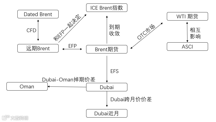 在当前石油定价体系中,各市场、各层级间市场,通过各种复杂的金融工具将其联系起来,形成了一个复杂的链接网,进而实现各市场的高效联动。比如,Brent期货采用的是现金交割,到期收敛于ICE Brent价格指数,而ICE Brent价格指数是根据远期Brent、EFP(期转现)以及PRAs评估价格来编制的,同时Brent期货又通过EFP市场实现与远期Brent市场的联动,远期Brent通过CFD(Dated Brent同远期Brent之间的价差交易)同Dated Brent市场形成联动, Dated Brent又是Platts采用多个层面的信息进行评估的,而这些层面的信息也包括CFD、远期市场、EFP和期货市场。同样,在WTI综合体系中,各种现货市场基准价格与期货市场密切相关。Dubai原油价格通常使用Dubai/Brent原油掉期合约和Dubai跨月掉期合约的信息得出, Oman原油的价格又是基于Dubai原油价格和Dubai-Oman的掉期价差得出的,而场外衍生品市场可按照客户的需求定制个性化的金融工具,这些金融工具也进一步加强了各市场、各层级间的联动效应,进而根据时间、地点和质量的差异来确定不同地区原油的价格。