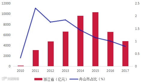 2017年浙江省跨境人民币结算量为4788亿元,占全国的5.9%;2017年舟山市跨境人民币结算量为38亿元,占全省的0.8%。
