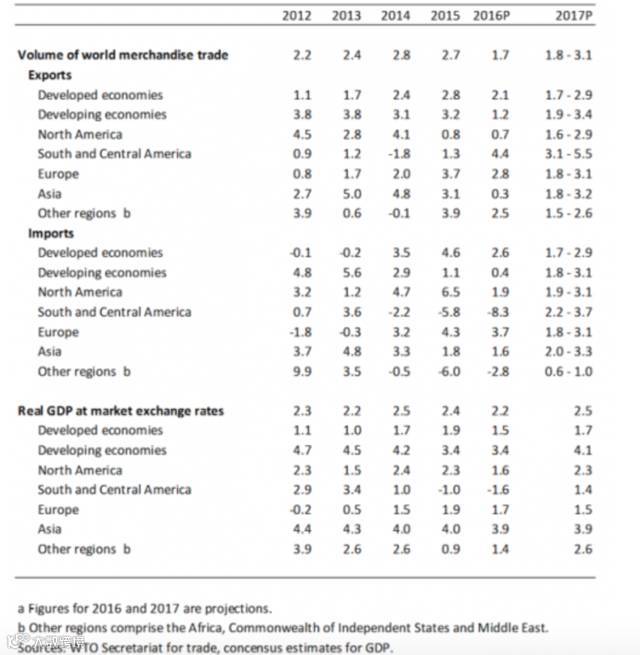 WTO下调对今明两年出口和进口增长速度预期,将2016年全球贸易增速预期下调至1.7%,2017年增速预期下调至1.8%-3.1%。而2016年全球GDP增速预期为2.2%,这意味着全球贸易和生产增长速度将达到2009年金融危机以来最缓慢速度。
