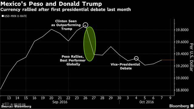 北京时间10月10日上午9点,美国大选将迎来第二场电视辩论,希拉里和特朗普再次面对面交锋。而在此之前,墨西哥比索已开始飙升。