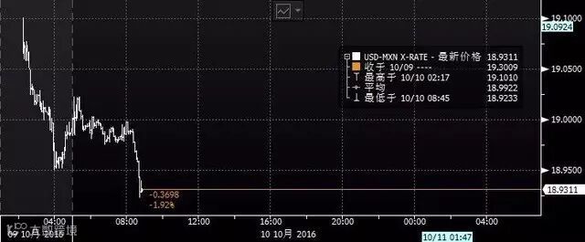 周一,在美国大选“二辩”之前,美元/墨西哥比索跌幅扩大至2%,跌至18.9234。市场已将比索汇率视为特朗普表现的替代指标。随着2005年一段关于特朗普出言极度侮辱女性的视频被曝光,一些共和党内的重量级政治人物纷纷谴责并撤回对特朗普的支持,甚至要求其退选,但特朗普却坚称不会退选。墨西哥比索对此事作出了反应,从两日的跌势中反弹。