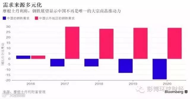 以下来自彭博环球财经的图表展示了摩根史丹利的观点:大宗商品不再只有中国一个主要需求来源。以钢铁为例,除了今年,从2017年到2020年的四年里,预计每年中国以外地区的钢铁需求同比增速都接近30%,中国均为负增长。
