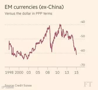 瑞士信贷数据显示,按照购买了平价计算,现在新兴市场货币兑美元汇率已经较2011年新兴市场繁荣时期贬值逾60%。重要的是,分析师用经通胀调整的实际汇率。在一个经济周期中,如果新兴市场国家经历高通胀,那么其名义汇率总体而言是贬值的。
