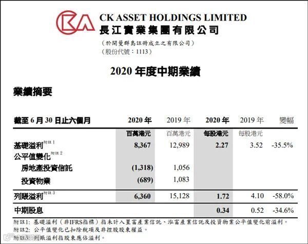 长实集团宣布2020中期派息为0.34港元,比去年少34.6%,对于盈利减少的原因,长实集团表示主要是因为新冠疫情对其业务带来了负面影响。