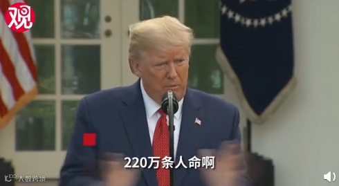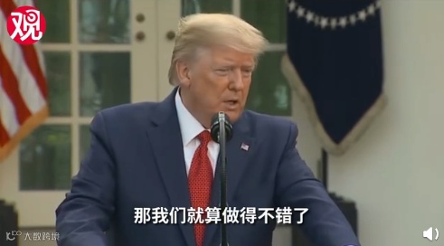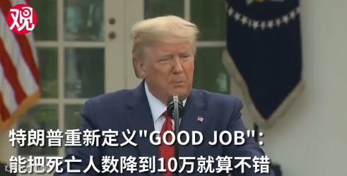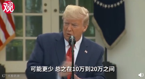 特朗普引用预测模型称,如果不采取社交距离防疫建议,美国可能有220万人或更多的人死于新冠肺炎,如果美国能把死亡人数控制在10万人以内,尽管“这是一个可怕的数字”,那么“我们做得还不错”(good job)。