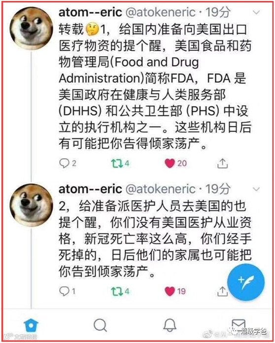 今天还看到一张截图,里边有两条重要提示:其一是提醒国内准备向美帝出口医疗物资的相关企业的,其二是提醒准备去美国支援的医护人员的。
