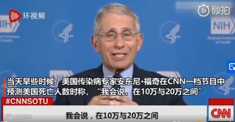 就在同一天早些时候,美国顶级传染病专家、有“抗疫队长”之称的安东尼•福奇在CNN一档节目中给出预测称:“我会说,在10万与20万之间”。
