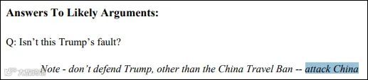 除此以外,备忘录里的一句话很有意思:“除了提及之前对中国实施的旅行禁令,不要为特朗普辩护——攻击中国就行。”