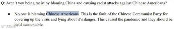例如,在被问及甩锅中国涉嫌煽动种族主义时,候选人被要求这样回答:“没有人在指责华裔美国人。这是中方的错,是他们‘掩盖’病毒,‘谎报’其危险性。这才导致了大流行,他们应该对此负责。”