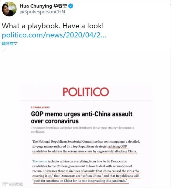 作者给他们提供了三条主要攻击路线,包括污蔑中国“掩盖”病毒导致疫情暴发,民主党人“对中国太温和”,以及共和党人将“推动制裁中国的计划,理由是后者涉及传播病毒”。