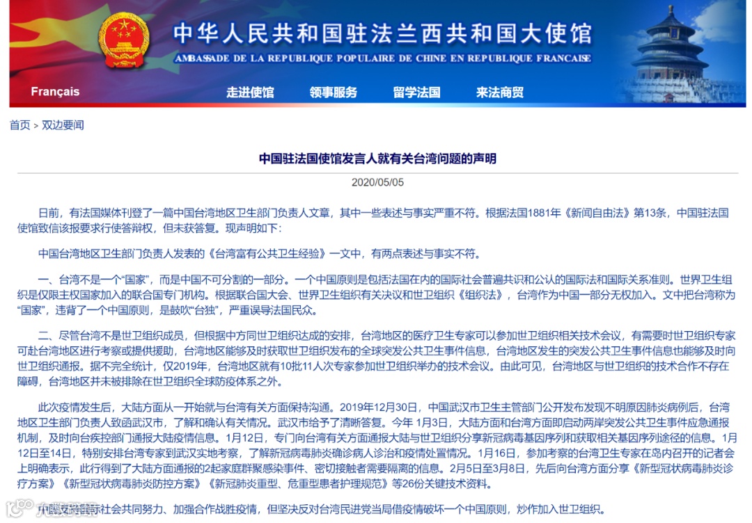 据中国驻法国大使馆官网消息,日前,有法国媒体刊登了一篇中国台湾地区卫生部门负责人文章,其中一些表述与事实严重不符。根据法国1881年《新闻自由法》第13条,中国驻法国使馆致信该报要求行使答辩权,但未获答复。大使馆现声明如下: