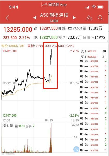 海外交易的富时A50期指瞬间快速拉升,涨幅突破2%。