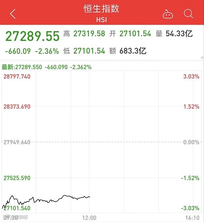 今日早上,港股开盘大跌后跌幅收窄,恒生指数开盘跌3%后向上回升,上午收盘恒生指数跌幅收窄至2.36%。