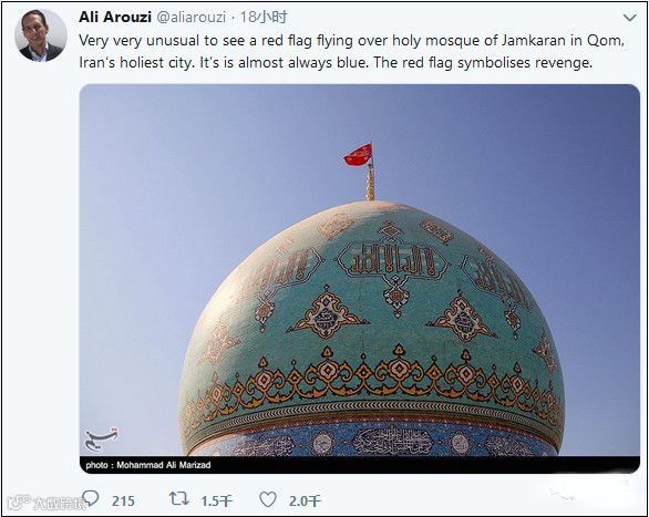 与此同时,伊朗还在贾姆卡兰清真寺顶端升起了“复仇红旗”!