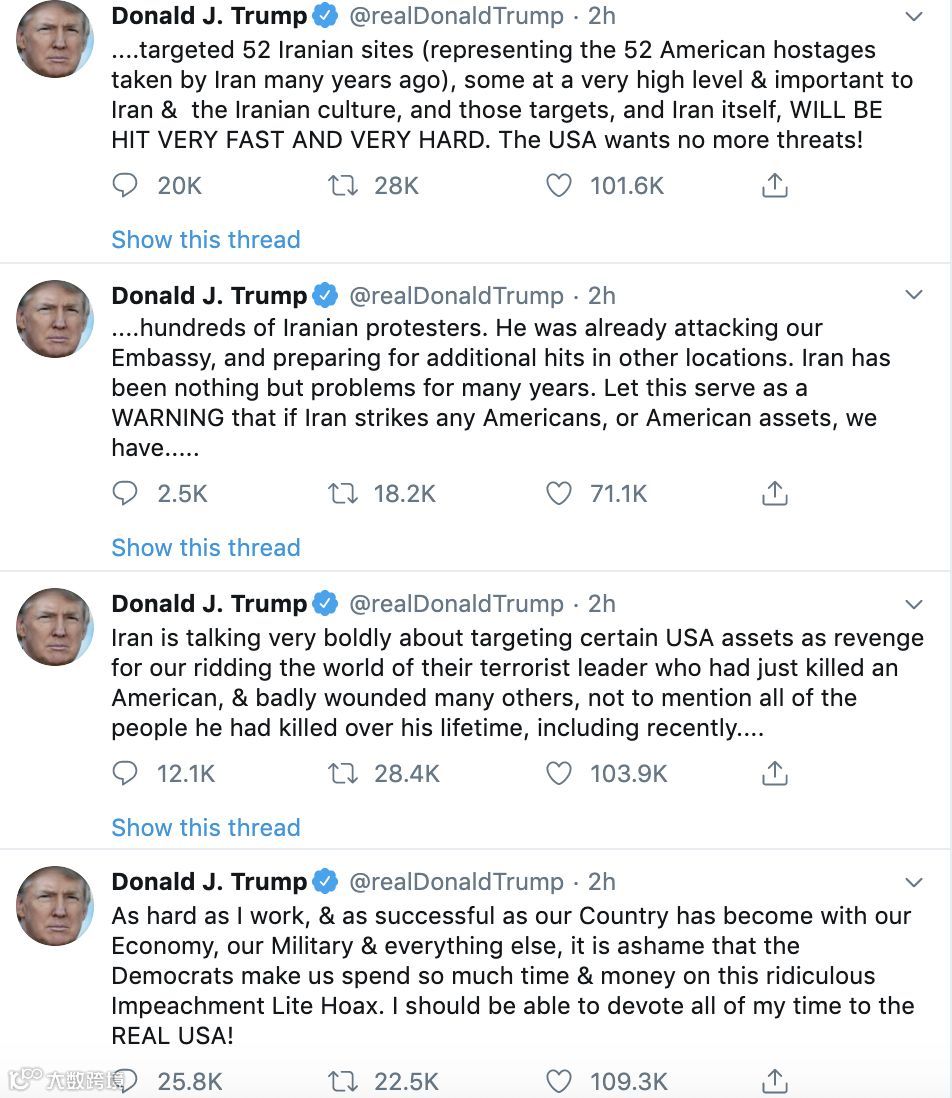 在美国基地遭受袭击之后,特朗普在推特上发言,向伊朗再次发出声嘶力竭的警告: