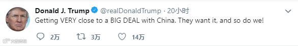 其次,特朗普亦于12日发布推特,表示贸易谈判已经“很接近一个重大协议”。