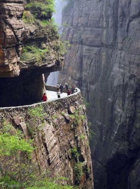 巍巍天路悬崖峭壁上悬,云中高挂。