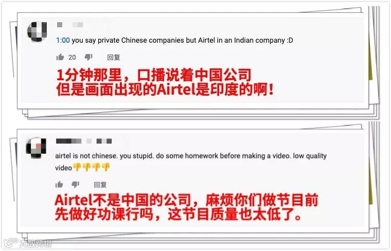 还有网友指出,从一些低级错误就能看出这档节目有多不靠谱。例如节目在说中国公司,但是对应的画面上,出现的Airtel其实是一家印度企业。
