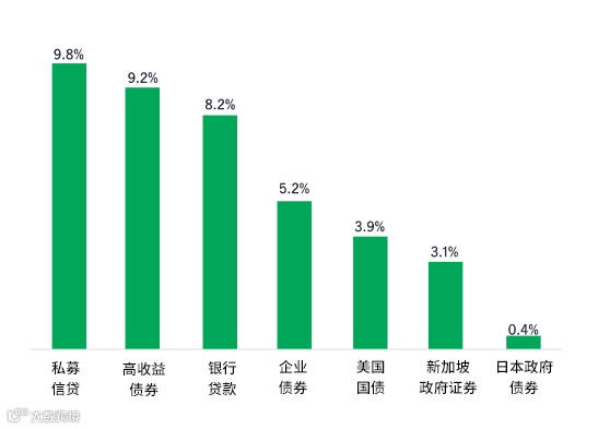 私募信贷及其他固定收益资产收益率对比。资料来源:Cliffwater,FactSet,宏利投资管理。私募信贷以Cliffwater直接贷款指数(三年期外流收益率 )为代表; 高收益债券由彭博高收益指数(最差收益)表示; 截至2022年9月30日,银行贷款由S&P/LSTA杠杆贷款100指数(到期收益率)表示。公司债券由彭博美国公司A级投资等级指数(到期收益率)表示; 美国国债、新加坡政府债券和日本政府债券以截至2022年12月31日的10年期收益率为代表。