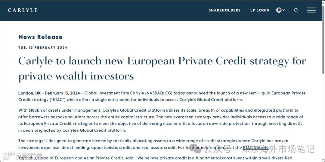 Carlyle凯雷官网2月13日转载了报道,对于这只新的-半流动性的-针对个人投资者的-欧洲私募信贷基金的期待还是很高的。