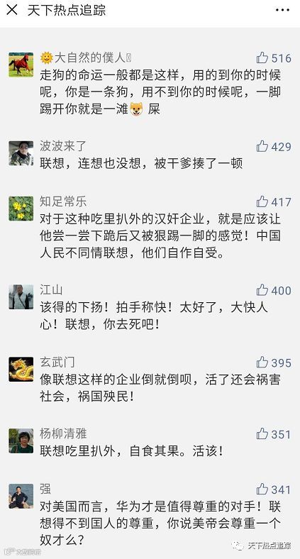 人家华为在前方为国挡枪,浴血奋战,你联想在后面又是释放逃跑论调,又是庆幸自己没有被制裁,这不是找抽吗?