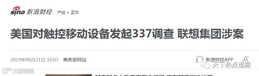 据新浪报道:2019年6月19日,美国国际贸易委员会(ITC)决定对联想、戴尔、惠普、等公司对美出口、在美进口和在美销售的上述产品侵犯专利权发起337调查。