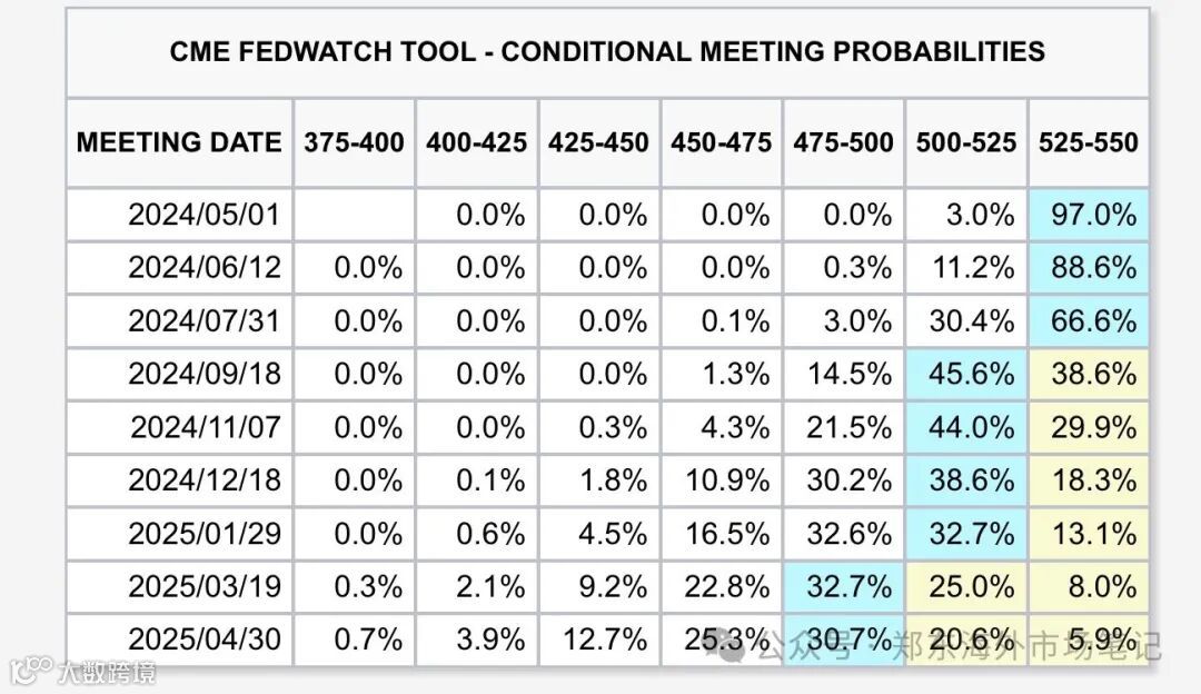 四月下旬的fedwatch数据,显示6月基本没可能降息,和一个月前显示的概率大相径庭。