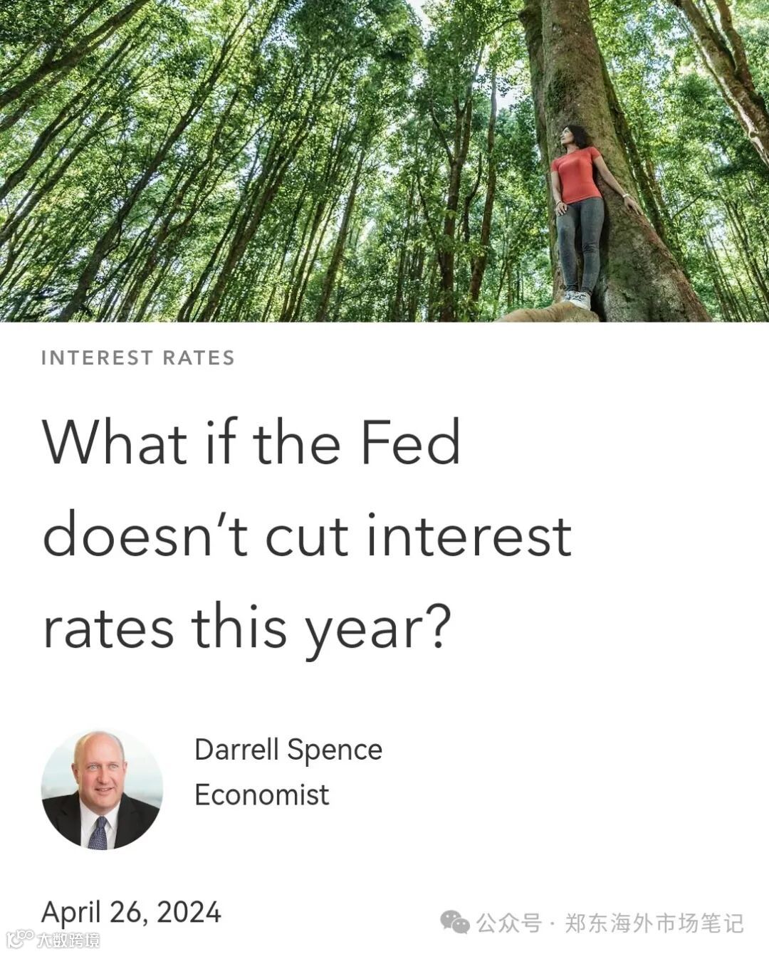 这个标题来自资本集团(Capital Group)经济学家Darrell Spence的最新文章,恰如标题所示,这篇文章讨论了假如美联储在今年不降息会怎样。既分析了不降息背后的原因,也展望了不降息情形下金融市场会如何反应。即使当下降息预期在下降,但至少截止2024年4月市场新共识依然是年内可能降息两次,所以Darrell这篇文章的标题可谓是非常“大胆”,也有那么一点标题党,因为他认为即使不降息,市场也会挺好。