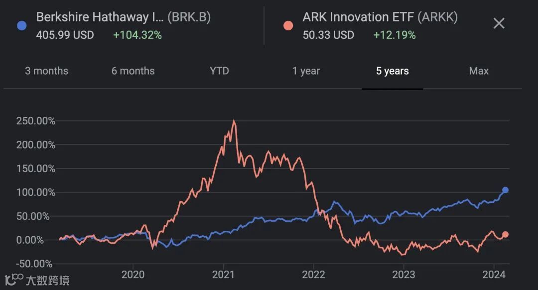 前两年这张木头姐和巴菲特业绩的对比图传播非常广泛,在经历了2020年的辉煌后,随着加息周期开始木头姐的基金经历了显著的调整,在2021年、2022年、2023年连续3年期间持续回撤,显著跑输伯克希尔的表现。但二者风格有着显著区分,在不同周期表现大相径庭也属正常。文末附上ARKK(代表性基金)过去1年的表现,也可作为参考。
