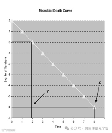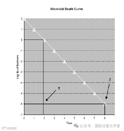 经验证,该工艺可将灭菌前的生物负载降至 100(Y 点),最低安全系数为再减少6 个log值(Z点)