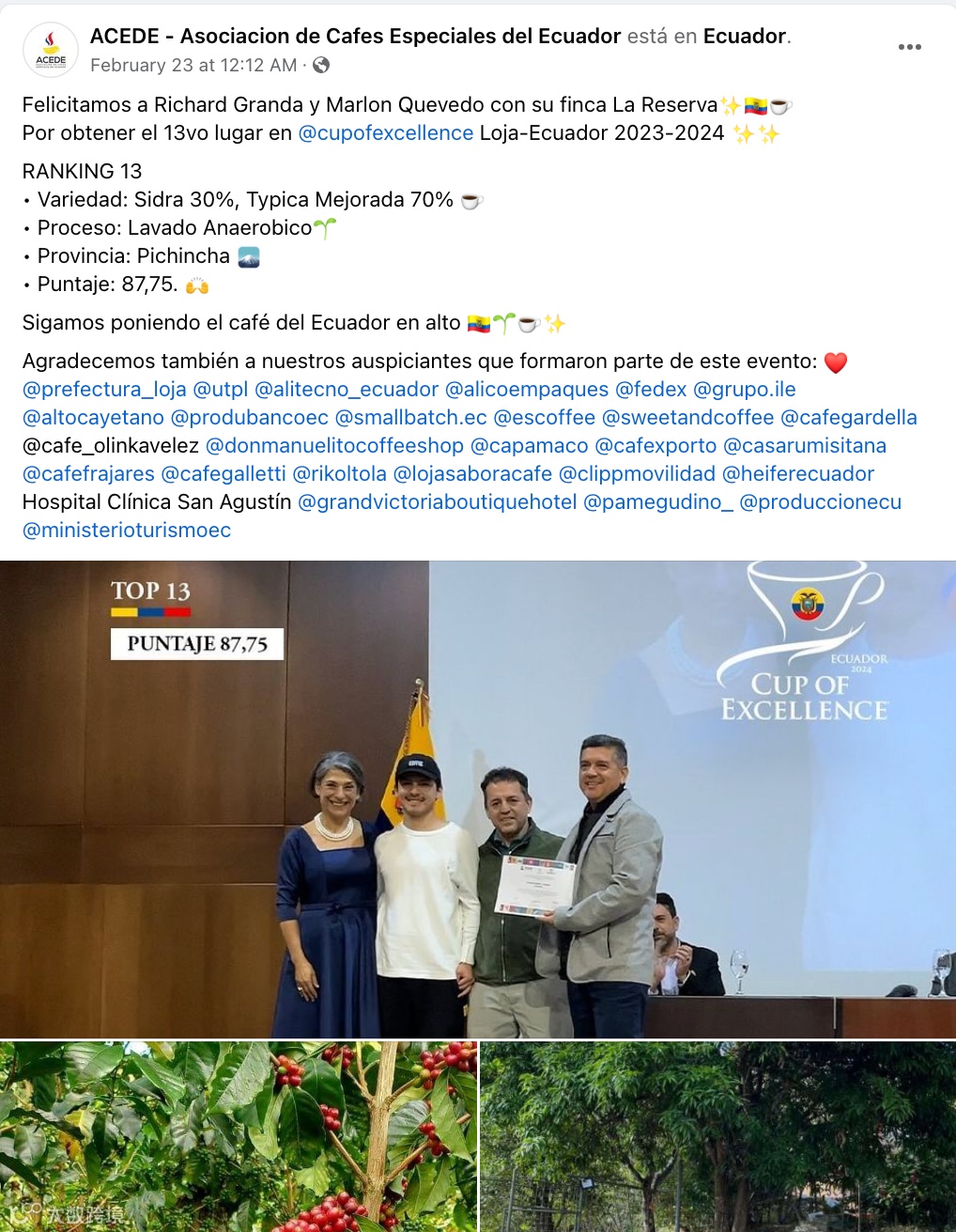我们的庄园种植有铁比卡、改良铁比卡、希爪和一些瑰夏等品种。在这个庄园里,我只与我的合作者一起工作,每周两次监控控制质量。由于我住在城市里并且有工作收入,所以可以持续注入资金来改善庄园,直到开始有我想要的结果以至于使其可持续发展。这是我们收获的第二年,我很高兴,因为明年会更好。