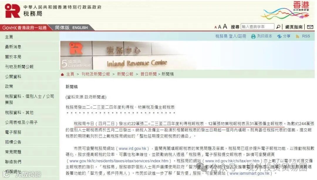 2024年4月2日,香港税务局发出约22万张利得税报税表,31万张雇主报税表,以及244万张个别人士报税表。香港公司两个重要的税种:利得税和薪俸税,都将在这个月批量申报。