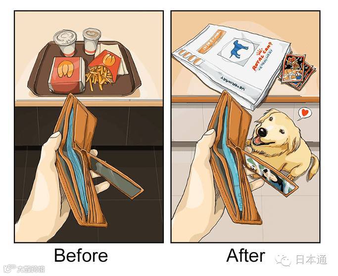 养宠物之前,美食、旅游、衣服……;养狗狗之后,狗粮、狗狗玩具、狗狗衣服……