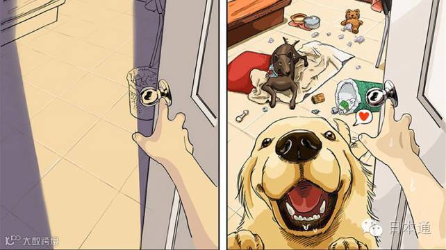这些插画的作者是一名叫maimaijohn的插图画家根据自己的实际生活所作的。画中的金毛巡回猎犬是十年之前作者捡回来的一只流浪狗。