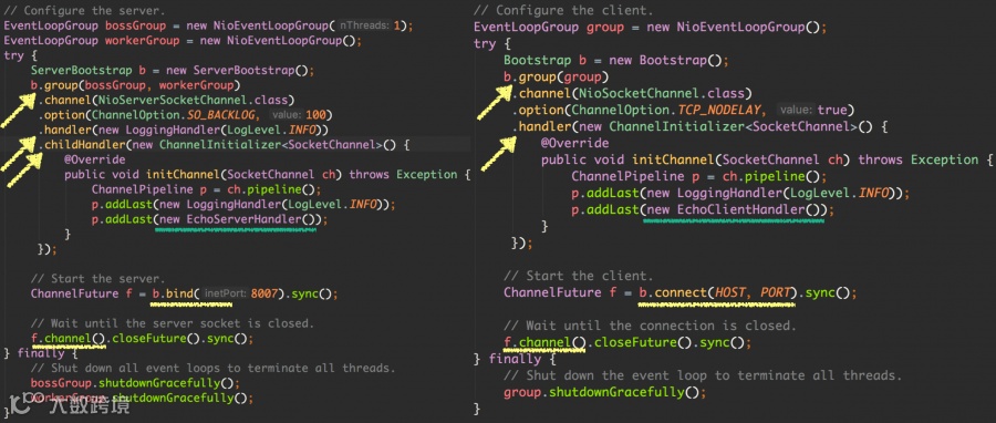 如果你想在EchoServer中也指定多个handler也可以像右边的EchoClient一样使用ChannelInitializer