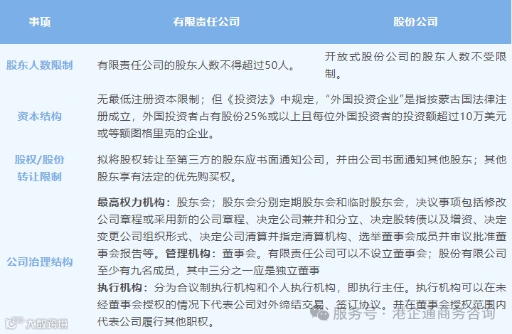 在蒙古国进行外商投资的企业组织形式主要为有限责任公司和股份公司。