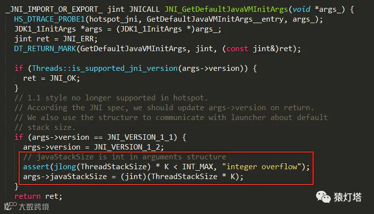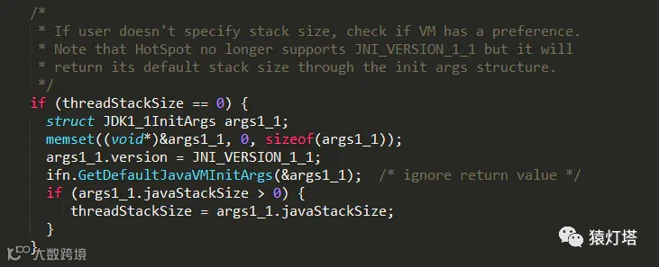如果启动参数未设置-Xss,即threadStackSize为0,则调用InvocationFunctions的GetDefaultJavaVMInitArgs方法获取JavaVM的初始化参数,即调用JVM.dll函数JNI_GetDefaultJavaVMInitArgs,定义在share\vm\prims\jni.cpp,实现如下: