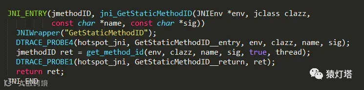 GetStaticMethodID方法查找指定方法名的静态方法,实现如下: