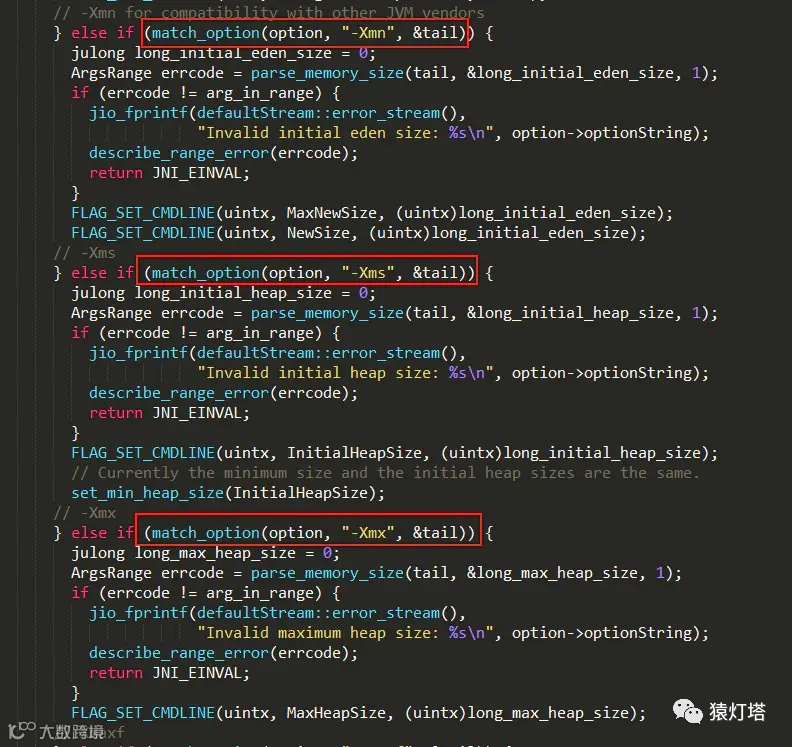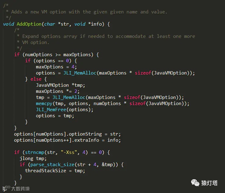 -Xss参数进行特殊处理,并设置threadStackSize,因为参数格式比较特殊,其它是key/value键值对,它是-Xss512的格式。后续Arguments类会对JavaVMOption数据进行再次处理,并验证参数的合理性。
