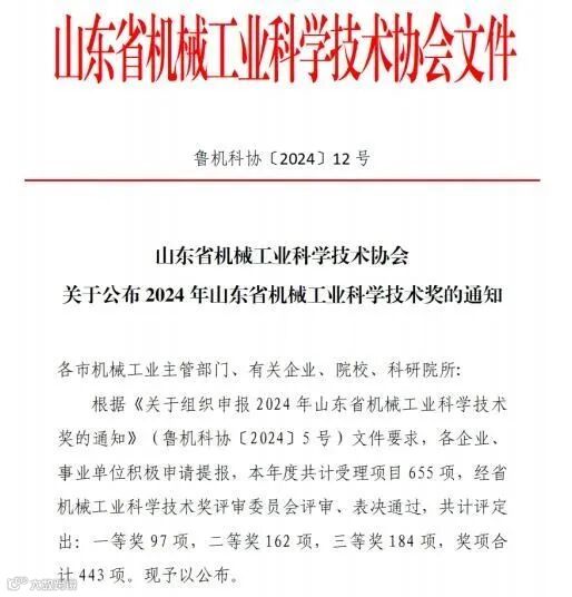 山东省机械工业科学技术奖是省部级科研成果奖,是由山东省机械工业科学技术协会设立的,每年评选一次,旨在选出成果技术创新性突出、技术经济指标先进、具备显著应用推广效益,在推动机械工业科学技术进步等方面有重大贡献的科技项目,具有较高的含金量。