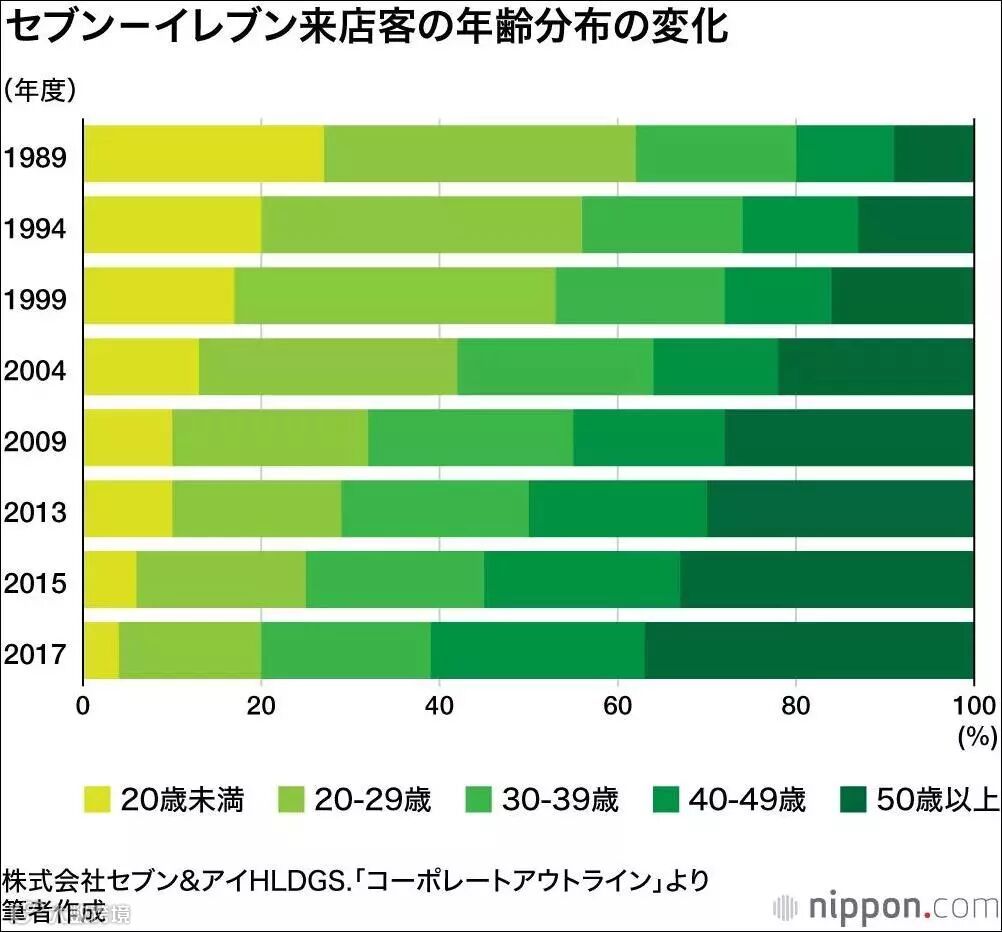 据日媒发布的一则数据显示,从7-11便利店的来店客人来看,1989年,20岁以下的年轻人占到62%,到了2017年降至仅20%。50岁以上的人则从9%增加到37%。