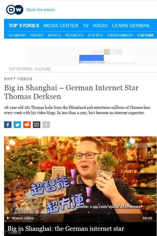 托马斯是居住在上海的德国人。十余年前,他来到中国,与他的中国妻子一起录制系列短视频,并上传到微博、Facebook等社交平台。视频中,他以一口流利的中文谈论他在中国的饮食、旅游、健康、家庭生活,因其视频幽默搞怪、风格多变,有 700万网友被他圈粉。这引起了德国之声(Deutsche Welle)的关注。