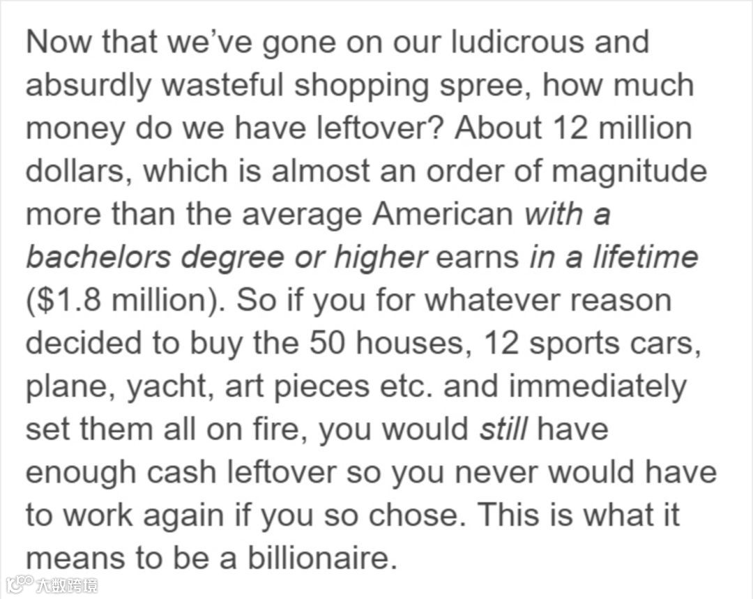 光是这些剩下的钱,就足够买下前面“标准级”亿万富翁所买的那些东西的两倍(例如100套豪华别墅和24辆超跑之类的)...