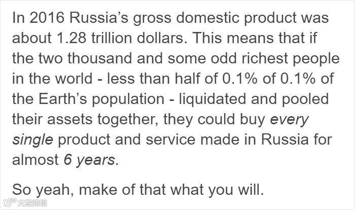 相比之下,如果那2000多位亿万富翁把全部资产兑现的话,可以买下整个俄罗斯生产的所有产品和服务将近6年!